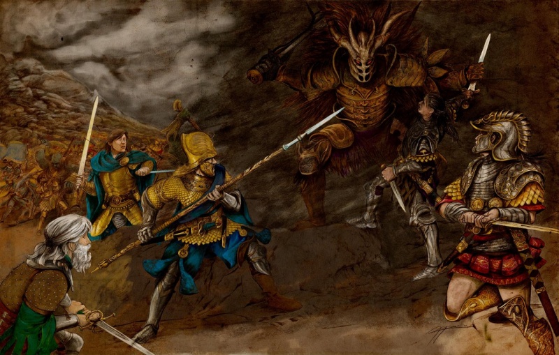 «Al termine del settimo anno d’assedio, infine, avvedendosi che le sue armate non potevano più opporsi alla collera delle schiere dell’Alleanza e che la sua fortezza era stata sguarnita, l’Oscuro Signore uscì dalla sua tenebrosa dimora e si accinse a sfidare a singolar tenzone i condottieri della Libere Genti; in preda al panico, ché invero terrificante era a vedersi il negro sembiante del Maia Caduto, i soldati indietreggiarono, coprendosi il volto con entrambe le mani, ché non osavano mirare il volto di colui che un tempo era stato il luogotenente di Morgoth; pure egli non si curò affatto di loro, ma si diresse verso i Signori dell’Alleanza, avendo in mente di trafiggere le loro mortali carni con la sua asta, né dovette cercare a lungo, ché costoro, a gloria della maestà di Iluvatar che è sopra i destini del mondo, non fuggirono ma lo attesero impavidi sul versante orientale dell’Orodruin, ove la malizia dell’Anello sovrano era maggiore e colui che lo portava sperava ottenere facile la vittoria. Primo, fra quanti erano nel novero dei comandanti dell’Alleanza, Gil-Galad non attese che il discepolo di Morgoth gli si scagliasse contro, ma, rapido come il vento che spira da occidente, affondò la sua portentosa Aiglos, che si diceva fosse stata forgiata da Feanor allorché costui era ancora a Valinor e la luce degli Alberi non era venuta meno; pure l’Oscuro Signore non si rivelò meno agile nell’evitarne il colpo, provocando lo sbilanciamento del re dei Noldor, sicché questi cadde e la sua arma si frantumò sotto di lui. Rapido, allora, il grifagno artiglio di Sauron afferrò il figlio di Fingon per il collo e coloro che erano con lui in quel momento si avvidero che la carni di Gil-Galad bruciavano, mentre la vita di costui veniva meno; scosso dalle grida che il sovrano degli Eldar emetteva nell’agonia della morte, lanciando un possente urlo di battaglia, Elendil cercò di portargli soccorso ma le oscure e oscene parole che il sire di Mordor pronunziò in quell’ora ne arrestarono l’impeto ed egli fu trafitto dall’asta che costui impugnava.