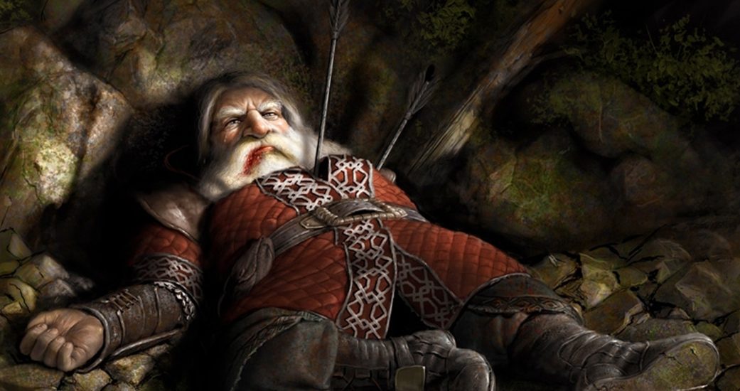 “L’affetto più prezioso che avevo mi è stato sottratto dalle armate di Mordor e io non oblierò mai il dolore che avvolge il mio animo; possa tuttavia giungere lesta l’ora della vendetta, ché il mio cuore freme e in esso la collera è forte”. Nessun altro parlò in tale triste ora, ché non vi erano parole nei loro idiomi atte a esprimere quanto ciascuno racchiudeva nel proprio cuore ed essi si ritirarono, cercando invano nel sonno beffardo la quiete che i loro animi avevano smarrito molti anni prima.