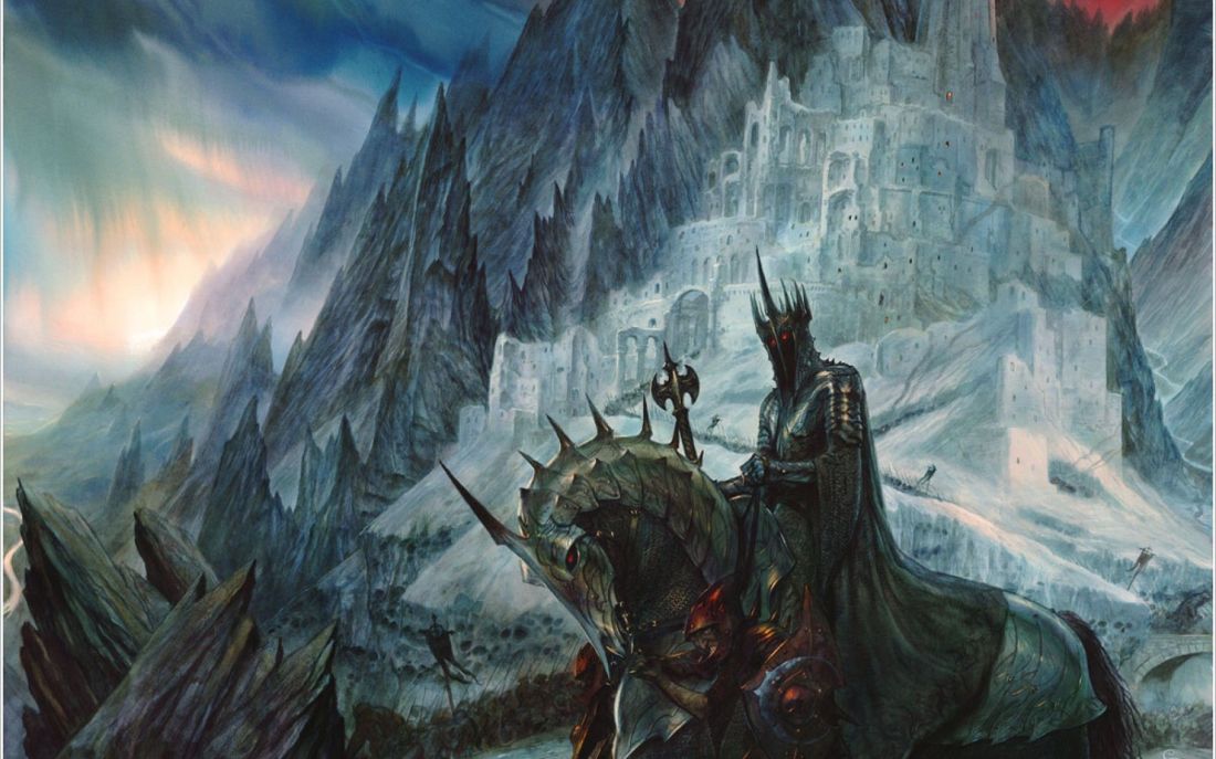 Mentre così discorrevano, Groin emise un urlo strozzato e parve a chi lo mirava che il colore dal suo viso fosse svanito; tremante, il suo dito indicava tre possenti armate che, lentamente, procedevano verso la città: tre enormi figure nere cavalcavano alla loro testa e due fra loro erano attorniate da soldati e dai mostruosi segugi da guerra di Dwar; la terza, più alta e imponente delle altre, procedeva solitaria e nessuno aveva l’ardire di marciare a meno di cento piedi da essa, ché emanava una malvagità tale da atterrire finanche i selvaggi Orchi e gli irascibili Troll. Una grande corona ferrea cingeva il suo capo e una pesante mazza pendeva al suo fianco sinistro, mentre una lama lunga sessanta pollici era cinta alla sua destra; autorità e terrore lo procedevano e un grave silenzio scese al suo arrivo, tale che perfino sugli spalti delle mura nessuno ebbe l’ardire di spezzarlo.