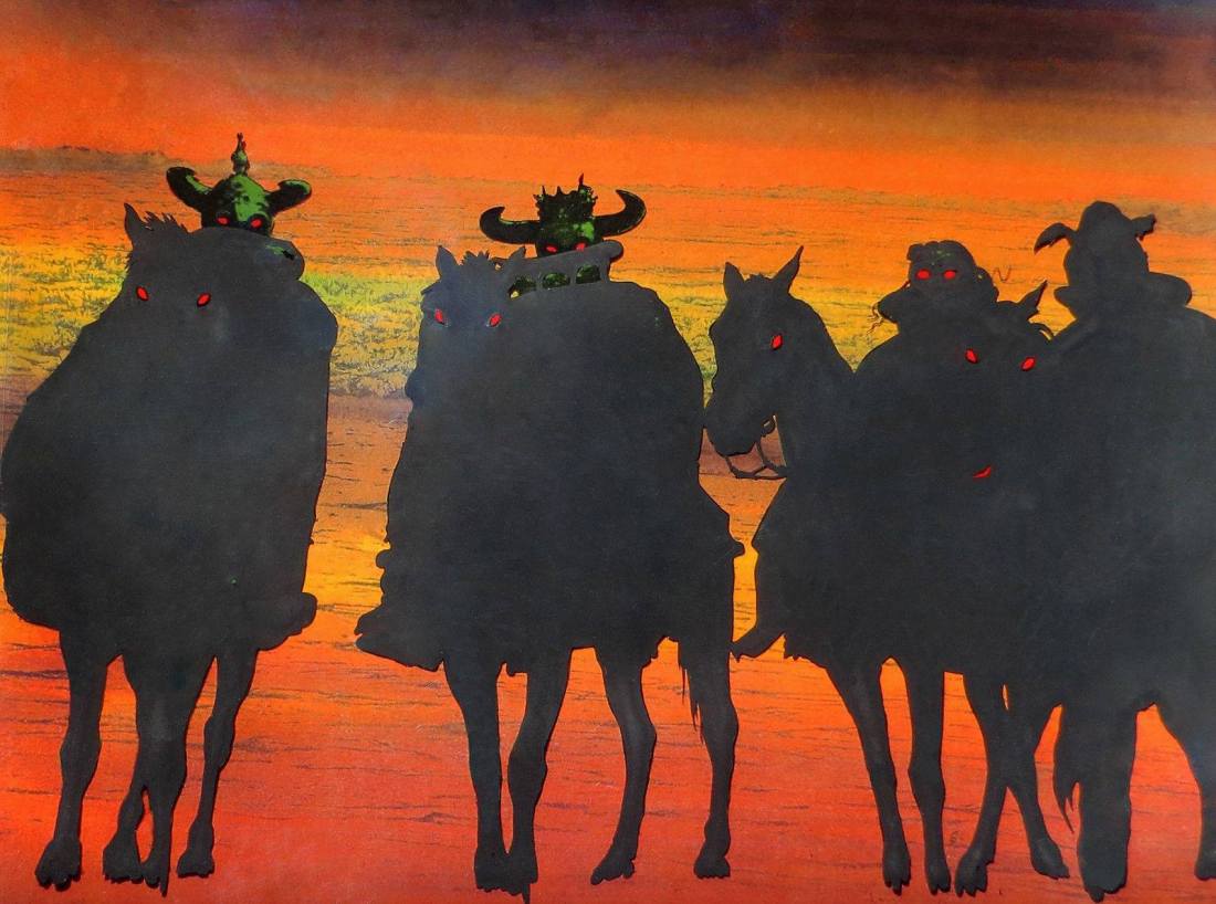 Allorché erano trascorsi alcuni mesi da che giacque con Gilmor, Erfëa la scorse, non veduto, dialogare con Akhôrahil e con un’altra donna che si ergeva accanto a lui; bella era, eppure il suo sembiante e quello del suo compagno sembravano nascosti da un velo di oscurità. Una pesante cappa pendeva sulle sue spalle e sul suo capo era posto un rosso diadema, che rifulgeva di un sinistro bagliore. Erfëa provò una grande paura nel guardarla ed il suo cuore tremò. Attese alcuni istanti, indeciso sul da farsi: infine, un quarto individuo, anch’egli sconosciuto al figlio di Gilnar si aggregò al terzetto. Erfëa vide con orrore Gilmor accasciarsi, come se un grande male fosse piombato su di lei: il suo cuore fu allora raggelato dalla paura, sicché non poté che accostare le sue mani alle tempie, mentre il suo respiro diveniva affannoso. Nelle atroci convulsioni che seguirono a tale visione, le sue tremanti mani sfiorarono l’elsa di Sulring e nuova forza fluì nelle sue vene, sicché riaprì gli occhi e gli parve che una grande ombra si fosse allontanata dal suo sembiante. Erfëa non poteva saperlo, eppure l’uomo che aveva colmato di paura il suo cuore, altri non era che Er-Mûrazôr, il Signore dei Nazgûl, il più potente fra quanti servirono Sauron. Molti secoli erano trascorsi dacché aveva calcato con i suoi neri stivali le strade lastricate di Armenelos ed egli giungeva in quella che un tempo era stata la sua terra natia perché inviato colà dal suo oscuro padrone.