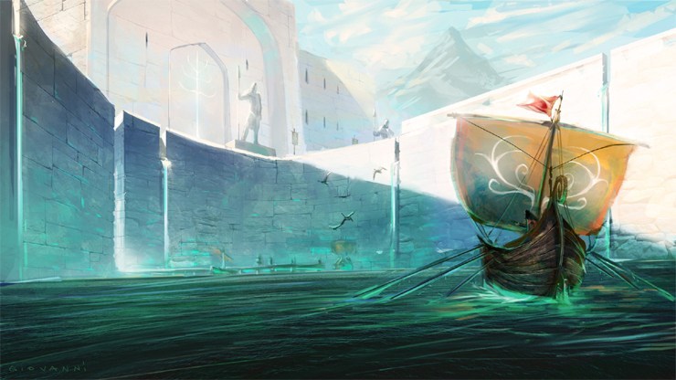 “Mio signore, invero lungimirante è stato il tuo pensiero. Sono prigioniero delle medesime paure inflittemi in questi anni di tormento, e sebbene il mio cuore desideri recarsi al di là del mare nella ridente Edhellond, ove ogni cosa è a me cara, qui ha dimorato per lungo tempo la mia anima ed essa esige il suo riscatto.” Parola più non pronunciò Erfea, ma fatto cenno al giovane principe di seguirlo, cavalcò a lungo nella notte, e dopo alcuni giorni raggiunse la sua città natia.