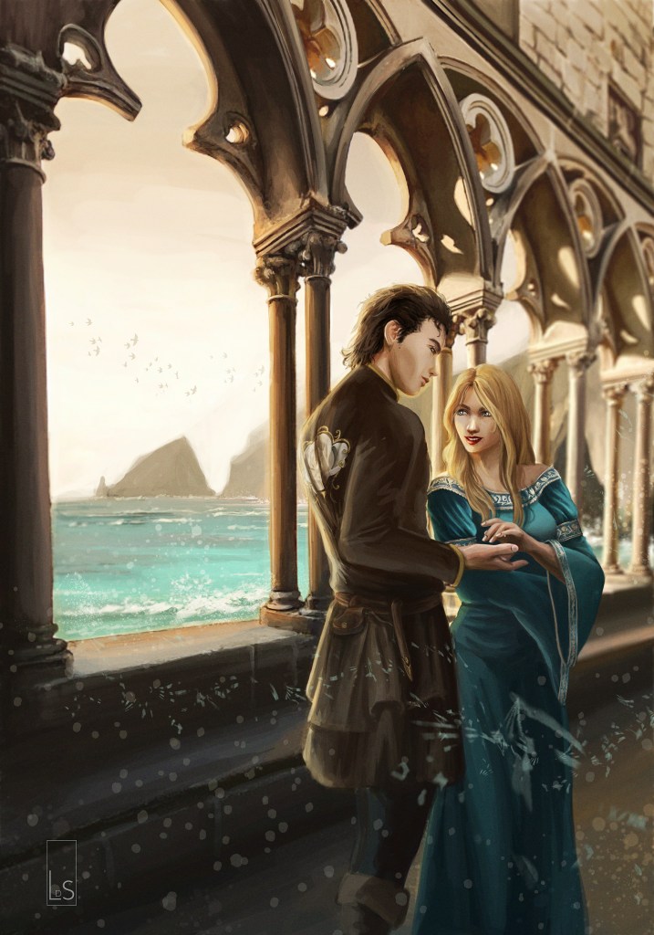 in questo caldissimo agosto vi invito a trascorrere qualche minuto nella grande isola di Numenor, insieme a Erfea e Miriel, i protagonisti di quella che sarà – se il tempo lo permetterà – la nuova copertina del Ciclo del Marinaio, opera della bravissima Livia De Simone!