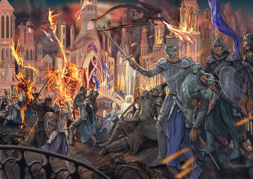 Possenti si levarono grida di giubilo e l’aria fu percorsa dagli squilli di numerose trombe d’oro e argento: i capitani condussero le loro truppe sugli spalti delle mura, attendendo impavidi che l’oscura marea piombasse su di loro. Erfea, tuttavia, parola non levò, ché condivideva il pensiero di Anarion, né aveva obliato la nequizia di Sauron, laonde per cui ordinò ai suoi soldati di assicurarsi che nessun nemico si impadronisse del cancello che conduceva a Osgiliath e alle contrade occidentali di Gondor.