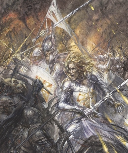 “Tocca quest’Uomo e la tua lama dovrà macchiarsi di un doppio crimine!”; sì bella appariva la sovrana di Numenor, nonostante la ferita sul capo ottenebrasse la calda luce dei suoi capelli, che finanche il Numenoreano Nero arrestò la sua lama, colto dal dubbio e dal rimorso; allora, impugnata Sulring – la quale, fortunatemente, giaceva non lungi da me – vibrai con disperazione un unico colpo verso l’alto, mentre con l’arto ferito spingevo Tar-Miriel lontano dal Numenoreano Nero. Eargon arretrò, stupefatto, e si toccò il petto ferito; allora mirò la grande carneficina che era in corso nella sala in basso e il suo sguardo espresse sconforto misto a pentimento.
