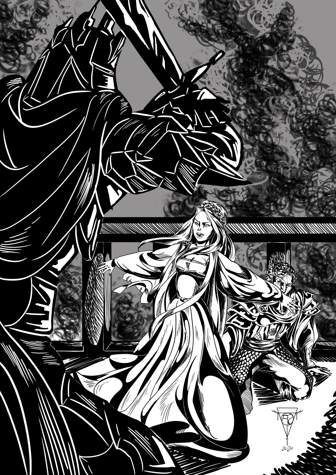 «Non so dire quanto tempo trascorse; infine, a causa della spossatezza che la ferita procurava alle mie carni, Eargon riuscì, con un abile colpo a disarmarmi; allora la rabbia si impadronì della sua mente ed egli perse totalmente ogni barlume di ragione, gridando oscure parole, incomprensibili ai più; alta levò la lama e funesto sarebbe stato il mio destino se Tar-Miriel, pallida nel volto, ma ferma nella sua volontà, non gli si fosse parata dinanzi, pronunciando parole di sfida: