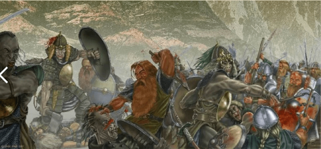 Improvviso, un rauco corno fu udito nella piana e gli sguardi di tutti furono attratti dalla visione di piccole figure che giungevano da levante; esultanti, i cavalieri del Nemico si approssimarono ad andare loro incontro, ché credevano essere costoro i mercenari che i re dell’oriente avevano inviato in soccorso. Grande fu perciò la meraviglia e lo stupore dell’intero esercito di Mordor, allorché costoro udirono riecheggiare un nome per loro oscuro: “Khevialath! Khevialath!”(1) e si avvidero che costoro non erano uomini ma nani. Silenzio cadde allora fra quanti erano presenti nel campo di battaglia, rotto dal possente canto di battaglia di Erfea e di Groin, ché essi compresero quali aiuti erano giunti loro in quell’ora sì oscura; nuova speme sorse allora negli animi dei soldati dell’Alleanza, ché essi si avvidero che nuovi soccorsi giungevano e riacquistarono le forze che le crudeli ore di combattimento avevano sottratto loro. Incredulità si dipinse invece sui biechi volti degli schiavi di Mordor, ché essi non comprendevano da quale luogo fossero giunti quei nani le cui insegne erano sconosciute pressoché a tutti, eccetto a quelli della stirpe di Bavòr (2), che sino a quel momento si erano tenuti in disparte.